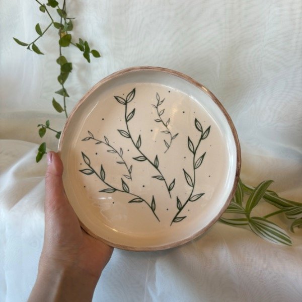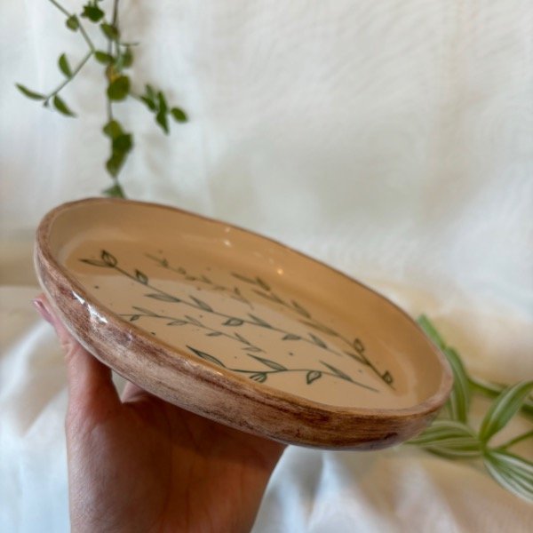 Plato playo 19 cm de diámetro, bordes irregulares con diseño de laurel.